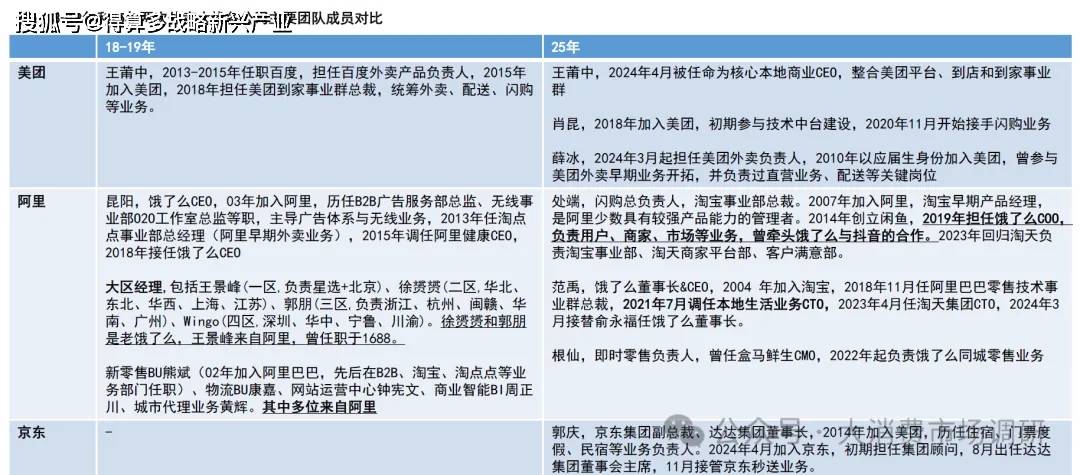 對比18-19年外賣大戰(zhàn),各平臺核心團隊更加成熟。其中美團核心成員保持穩(wěn)定,經(jīng)驗豐富;阿里淘寶閃購負責人處端曾任餓了么C00,餓了么團隊也較上一輪大戰(zhàn)積累了更豐富的行業(yè)經(jīng)驗;京東則在24年更換美團系高管來主導進行業(yè)務探索。