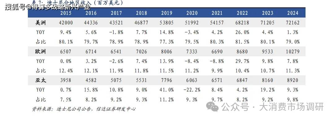 分地區(qū):2024 年,美洲/歐洲/亞太市場分別實現(xiàn)收入 721.6/102.8/89.2 億美元(同比+1.3%/7.8%/9.3%),占比79.0%/11.3%/9.8%。美洲/歐洲市場占比基本穩(wěn)定;亞太市場增長迅速,2015-24 年 CAGR 達 9.4%,收入占比與歐洲差距迅速縮小,或?qū)⒊^歐洲成為迪士尼第二大市場。