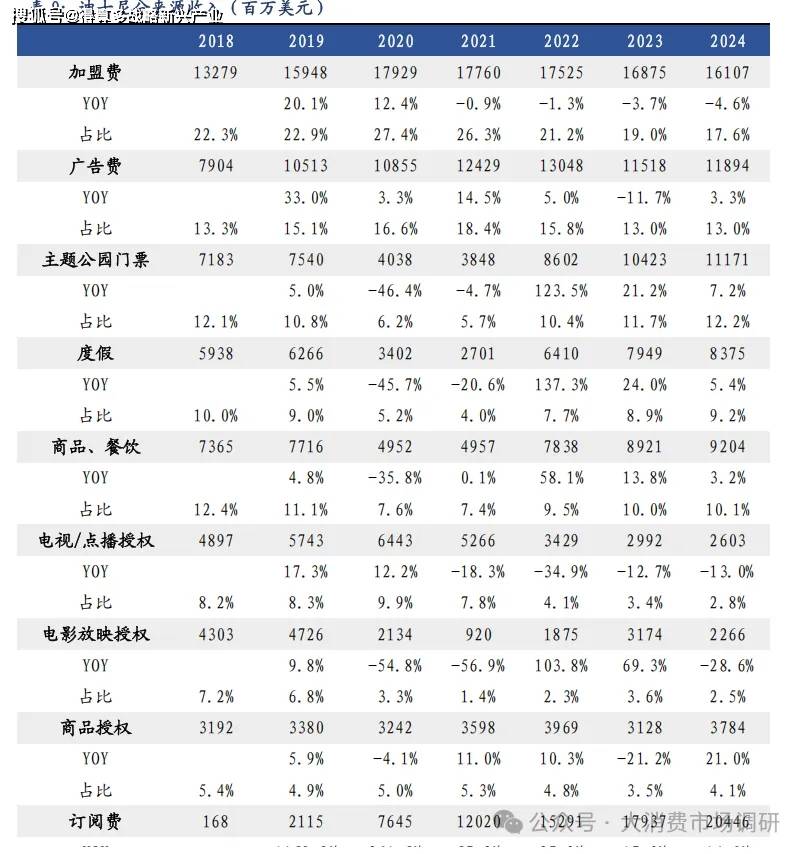 加盟費仍為主力,訂閱費迅猛增長。迪士尼有 10 種主要收入來源。2024 年,訂閱費(流媒體)收入 204.5 億美元(同比+14.0%),占比 22.4%,2018-24 年 CAGR 達 122.6%,增長迅速,為最大收入來源。加盟費(向分銷商收取的節(jié)目傳輸費)收入 161.1 億美元(同比-4.6%),占比 17.6%,為第二大收入來源。家庭娛樂(影視購買&光盤購買、租賃)收入 7.5 億美元(同比-19.1%),占比 0.8%;受流媒體沖擊,收入占比連續(xù) 5 年降低。